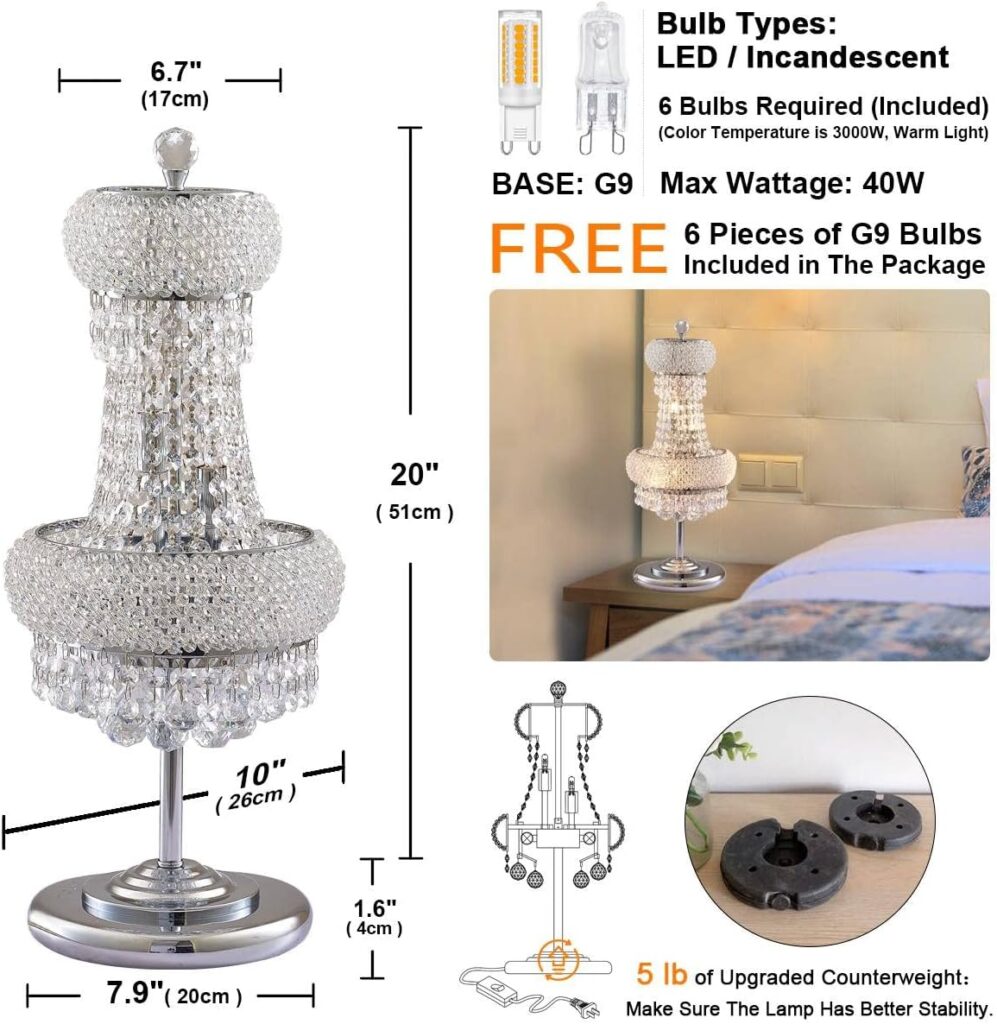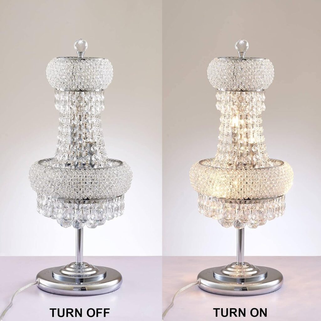 - The crystal table Lamp Size With dimensions of H 21.7″ x W 9.8″ x L 9.8″, this table lamp is suitable for any home or office desktop.