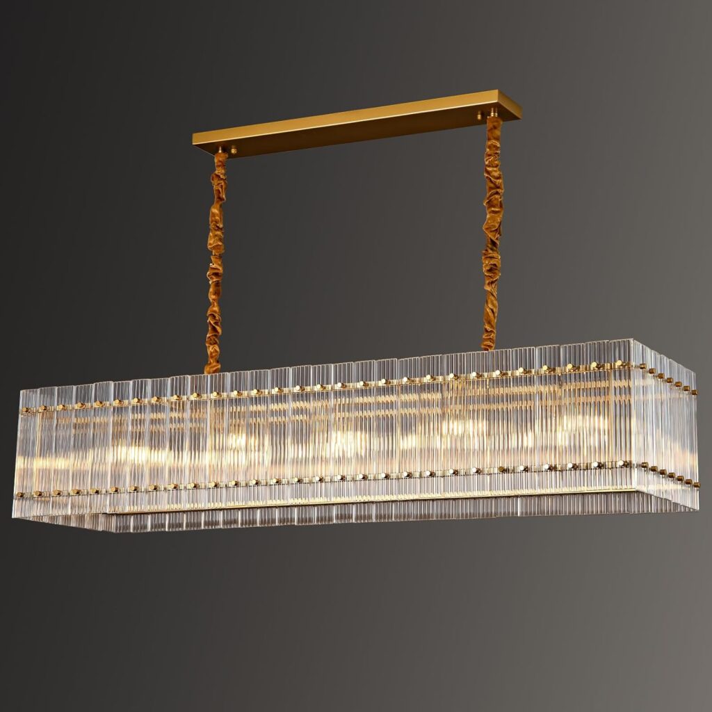 Gold Chandeliers for Dining Room,55‘’Kitchen Island Lighting, Rectangular Water Ripple Glass Chandeliers, Adjustable Chandelier Over Dining Table, Living Room, Kitchen Island