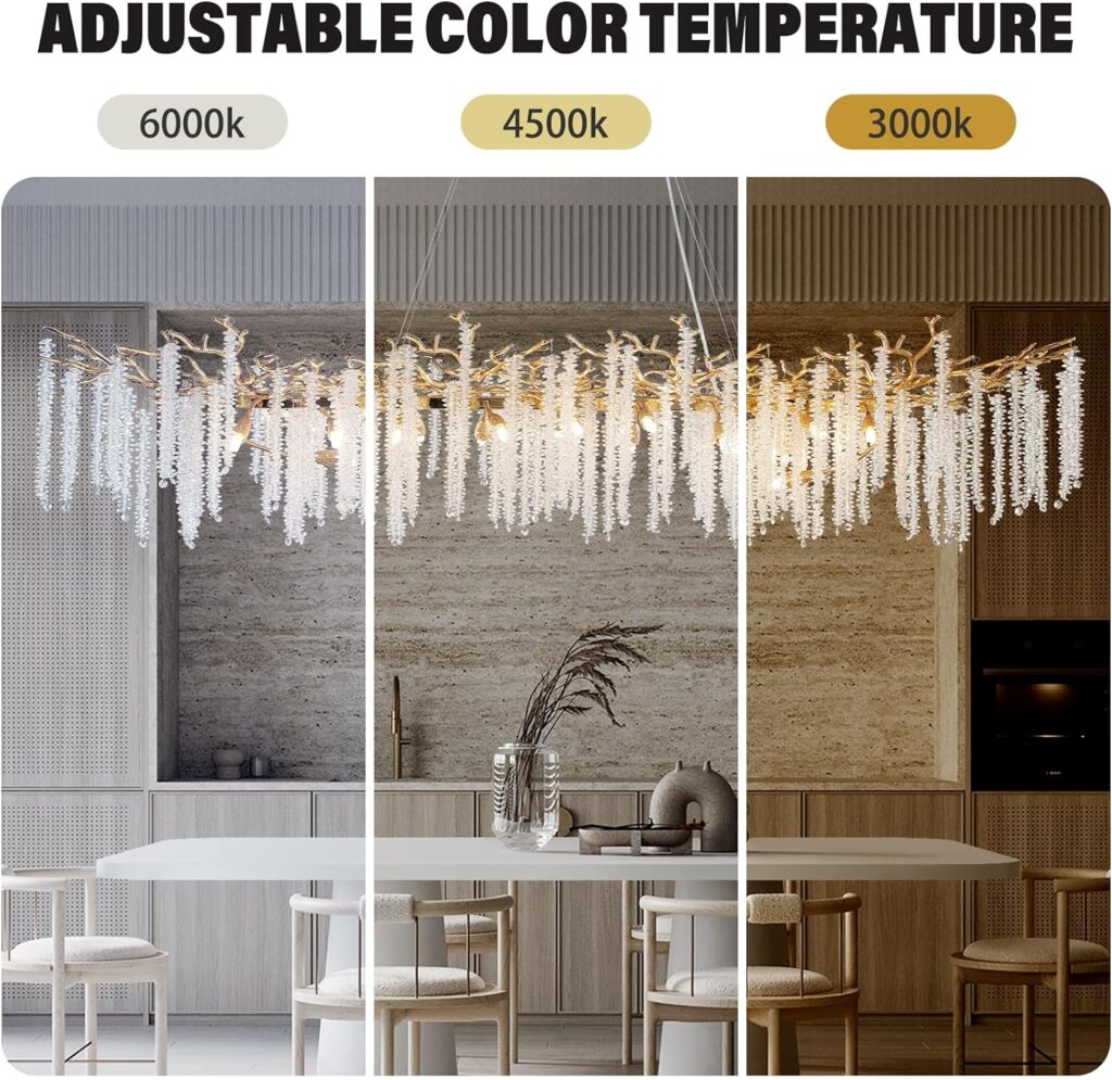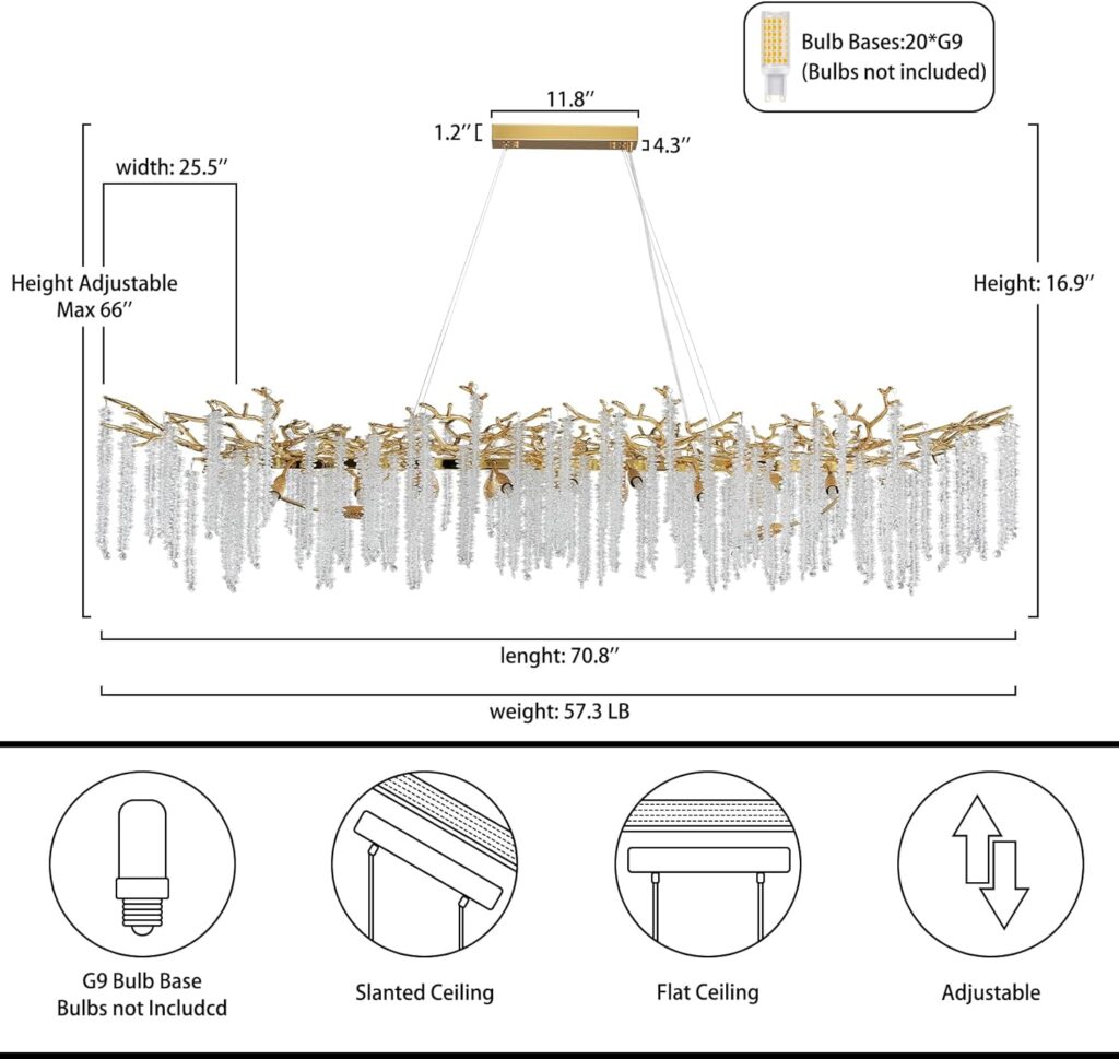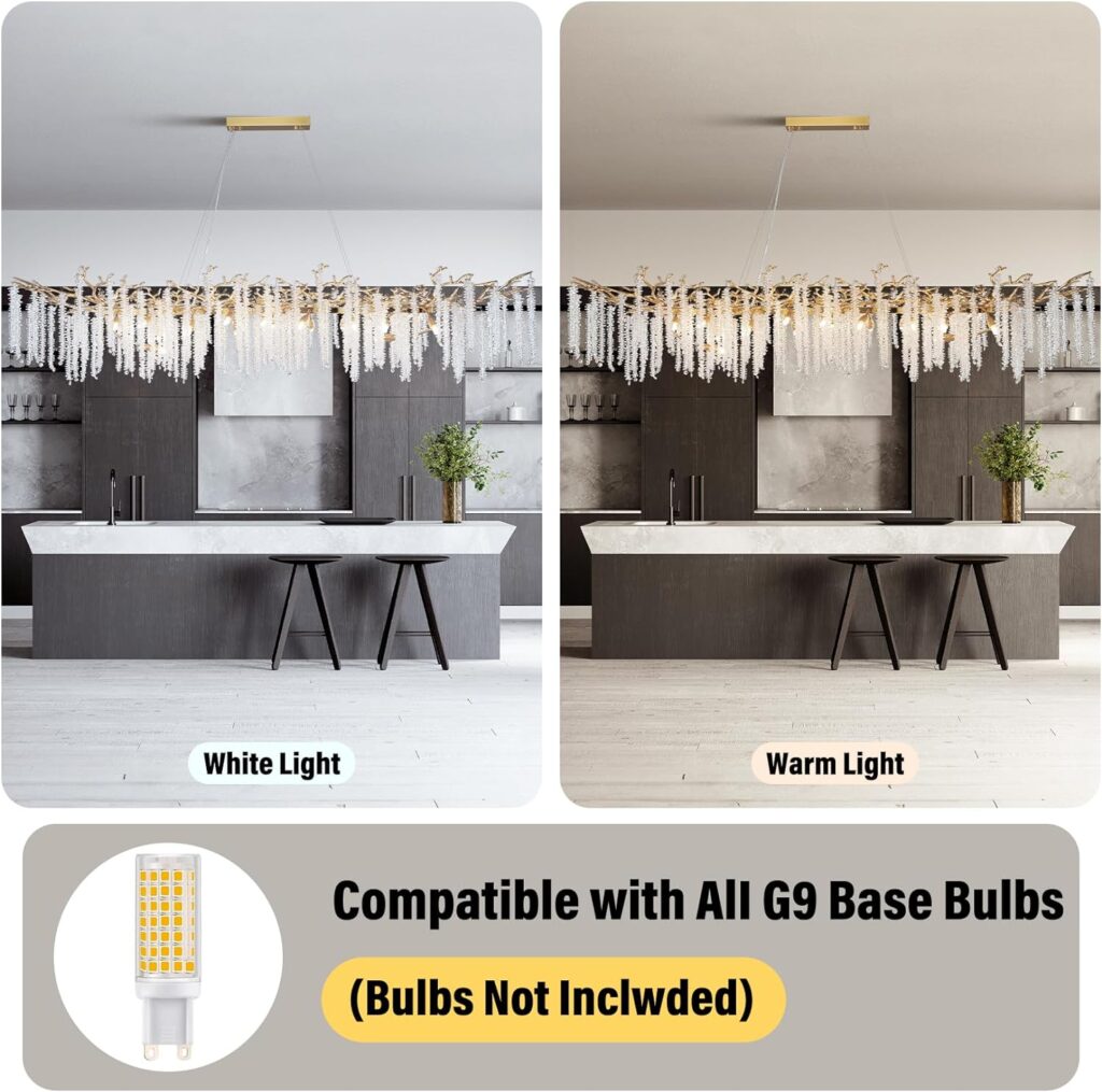• 【COMPATIBLE DIMMING BULBS】This rectangular branch crystal chandelier does not include light bulbs.It requires 20 x 110v G9 bulbs,and it is recommended to use 3000K warm white light bulbs. Dimming can be achieved when using dimmable bulbs with a compatible dimmer switch.