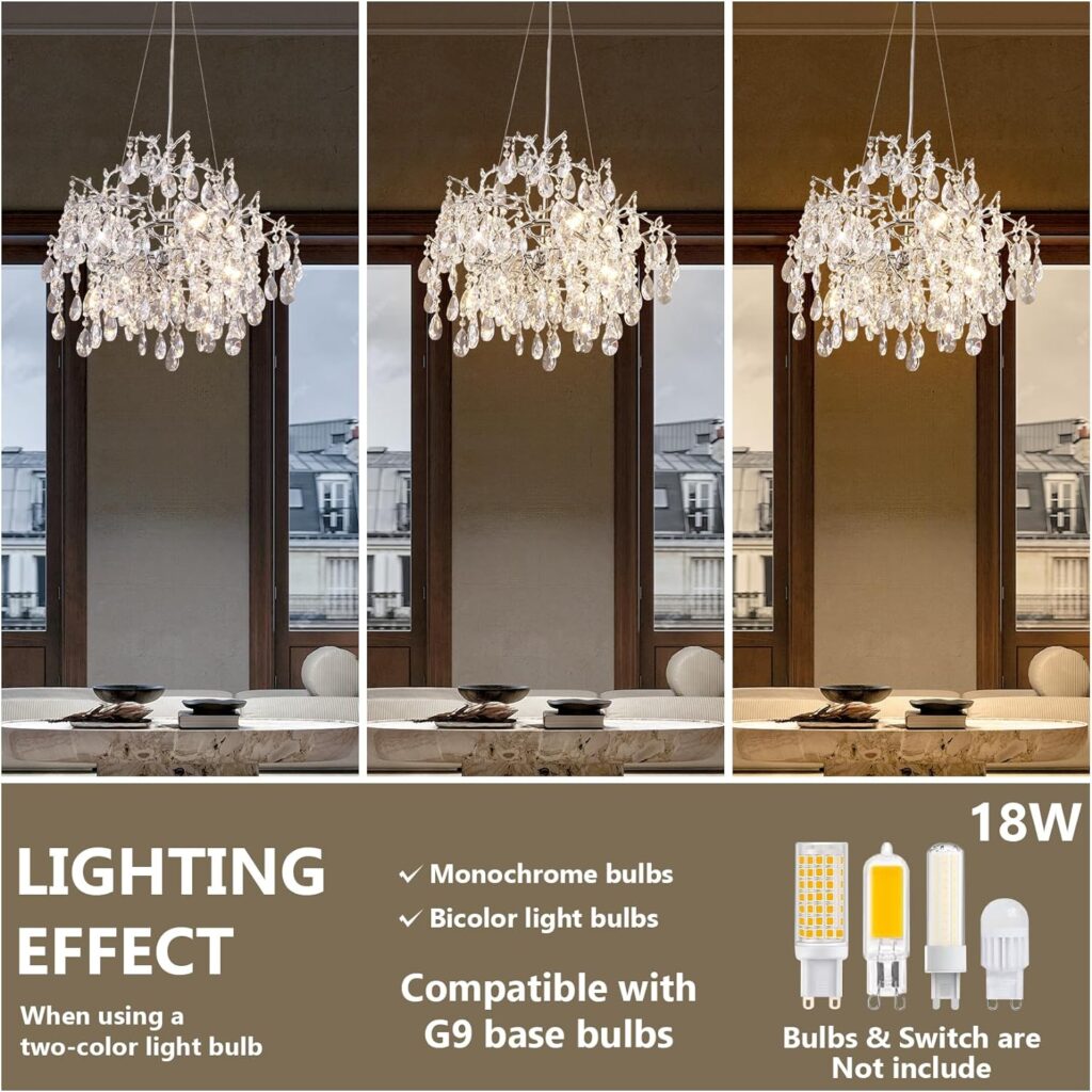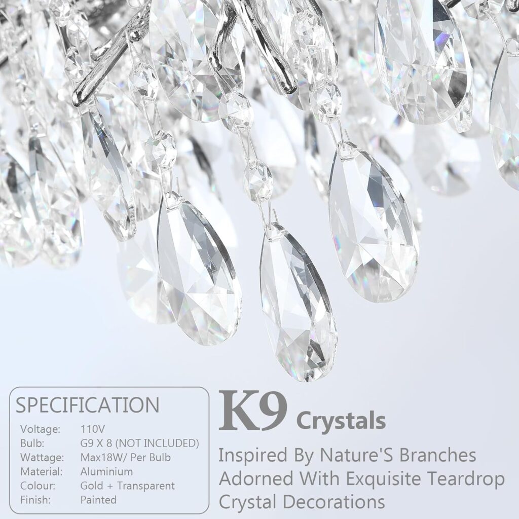 - 【COMPATIBLE DIMMING G9 BULBS】This modern branch crystal chandelier does not include light bulbs. It operates on a 110V AC power supply and requires 8*G9 bulbs. It is recommended to use 3000K warm white light bulbs. Dimming functionality can be achieved when using dimmable bulbs with a compatible dimmer switch.