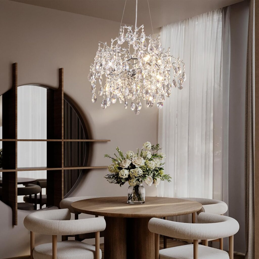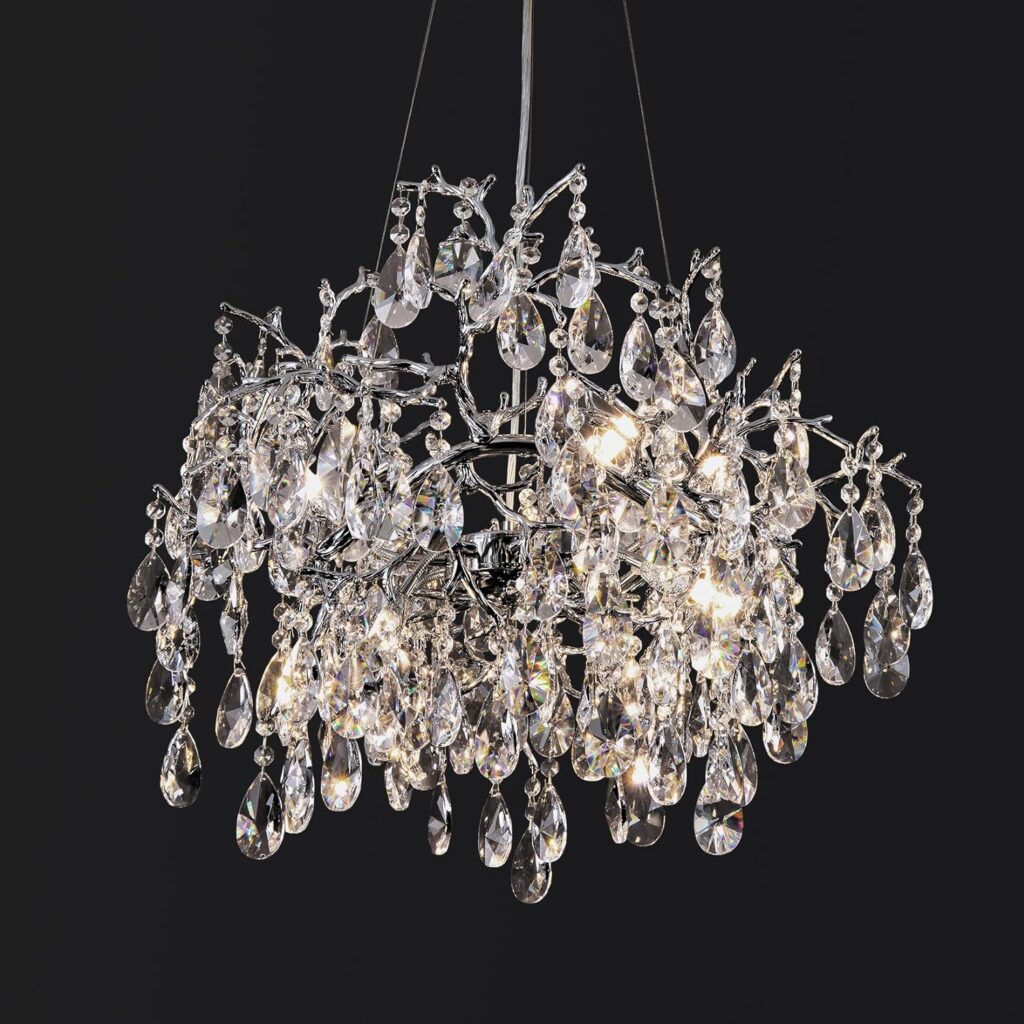 Modern Crystal Chandelier – 23.6″ Silver Tree Branch Chandeliers for Dining Room,Round Raindrop Chandelier Over Table Light Fixture for Living Room, Foyer, High Ceiling